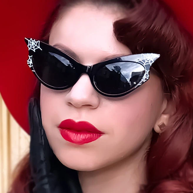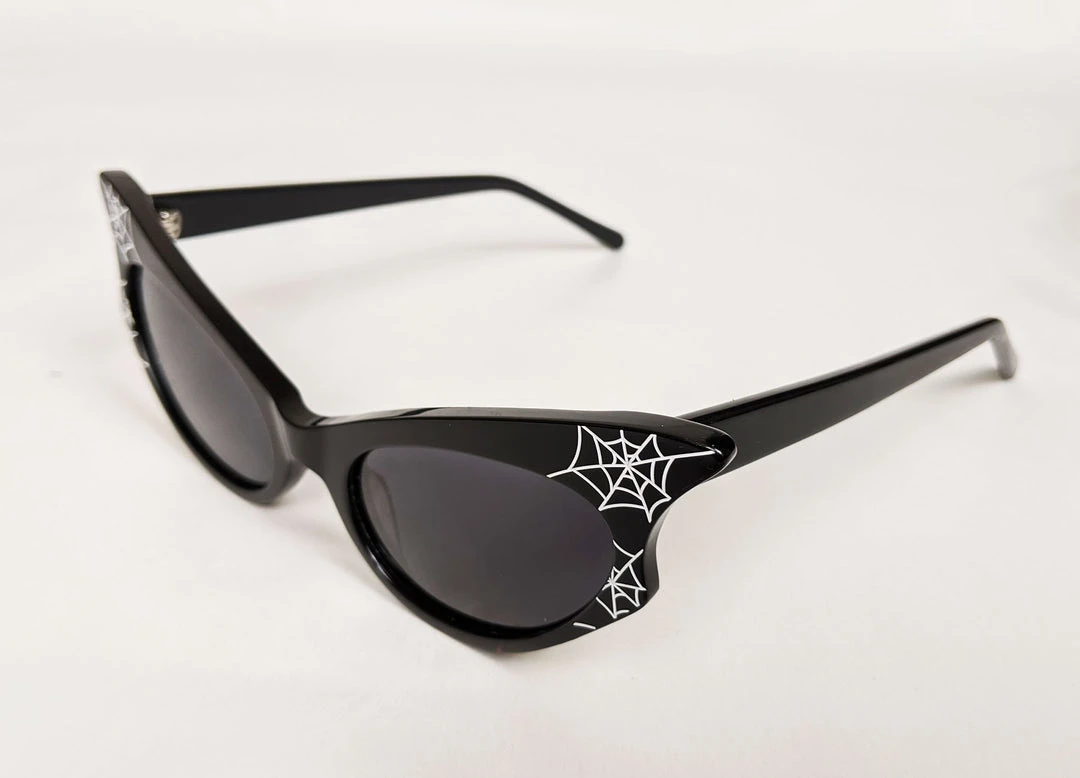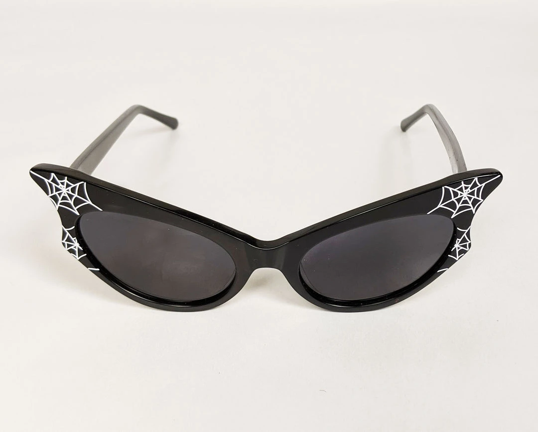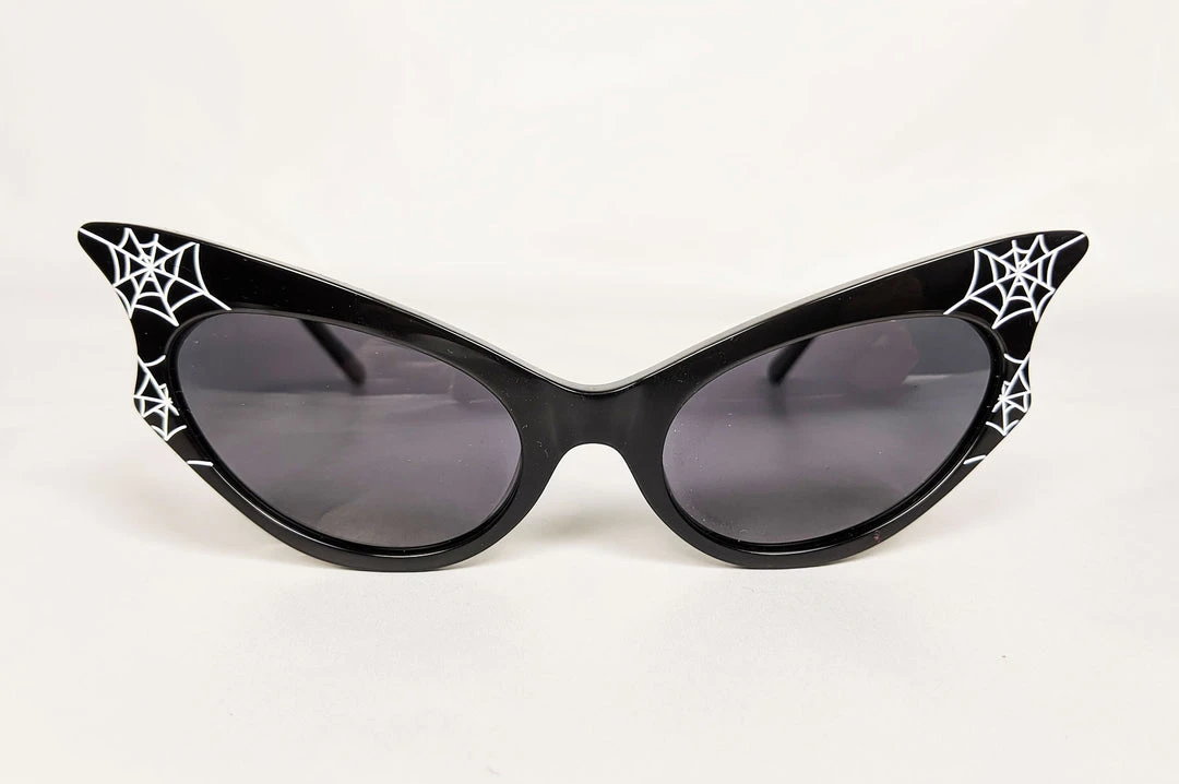 1950s style sunglasses with unique cat-eye shape. Features white carved spiderwebs for a spooky touch!