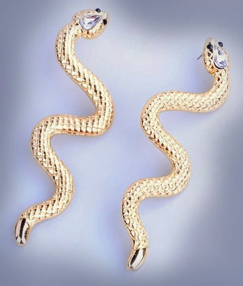 The “Arista” snake earrings make a dramatic statement. Gold toned accented with a clear crystal on the snake’s head and black stones for eyes. Length: 4.5″