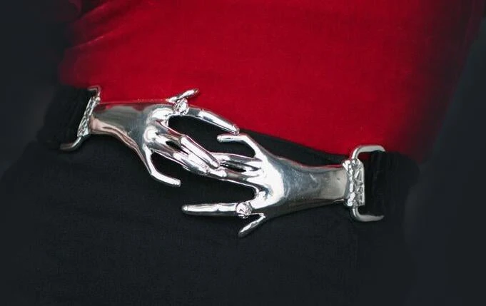 A modern reproduction of an extremely hard-to-find Victorian belt buckle includes an attached elastic stretch black belt that can be altered to fit.