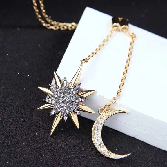 Delicate, dainty and shining, the Carol moon and star necklace is an elegant touch to any outfit whether casual or dressy, this necklace will accent it beautifully.