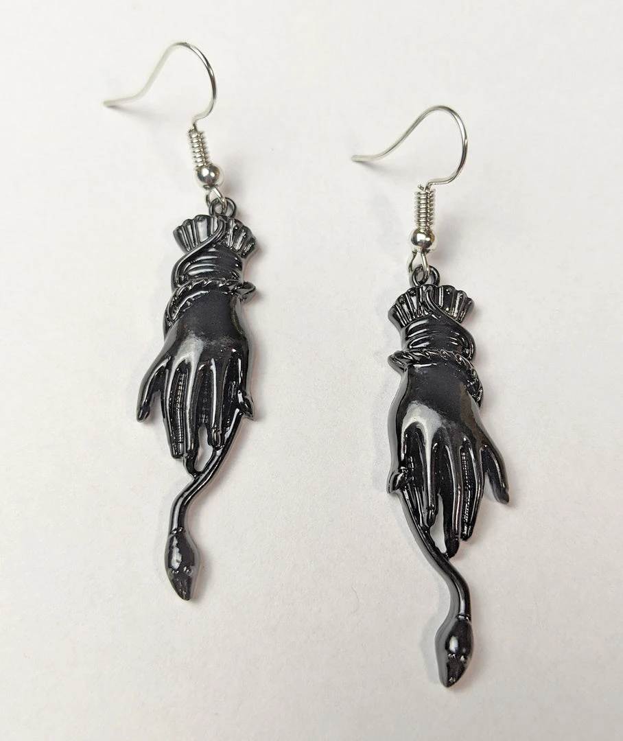 Features a hand holding a snake, two symbols that were strong in mourning jewelry of the Victorian era.