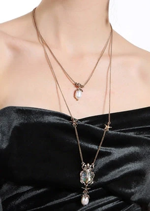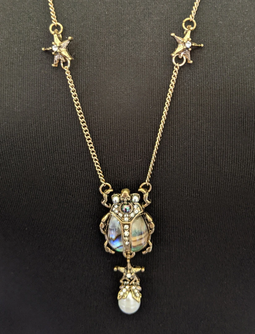 Two necklaces in one, can be worn together or on their own, one necklace features a baroque faux pearl and the other with a scarab and two stars.