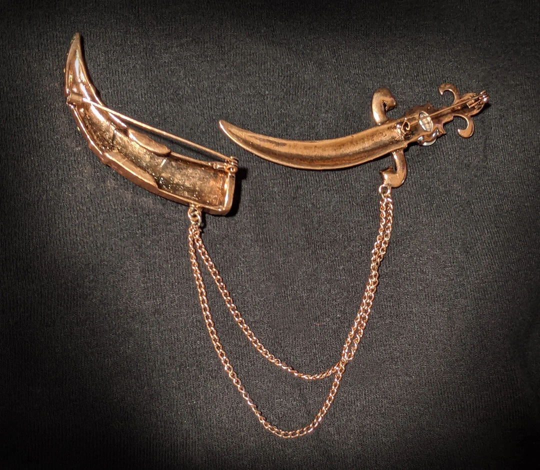 Based on styles very popular in the 1940s, rose gold-tone antique finish metal accented with assorted rhinestones. Can be worn with the blade in the sheath or pinned separately.