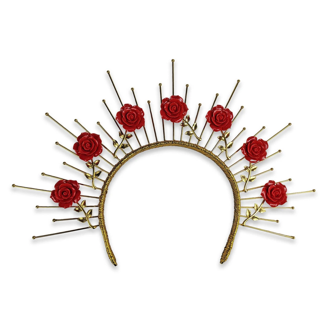 The Gaia crown is a dramatic gold-tone sunburst crown wrapped in a golden lamé ribbon. It features seven blood-red acrylic roses. The flexible headband can be shaped for a comfortable fit.