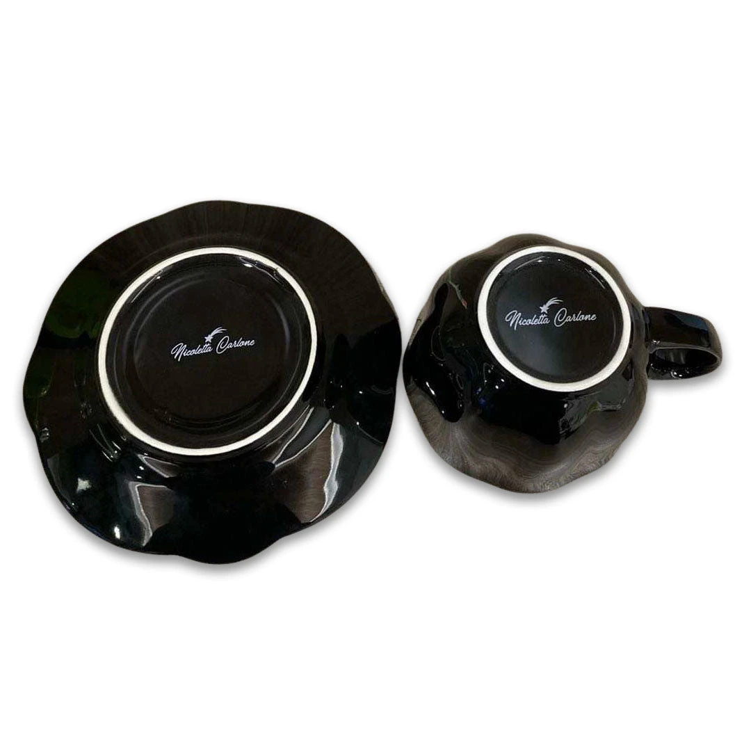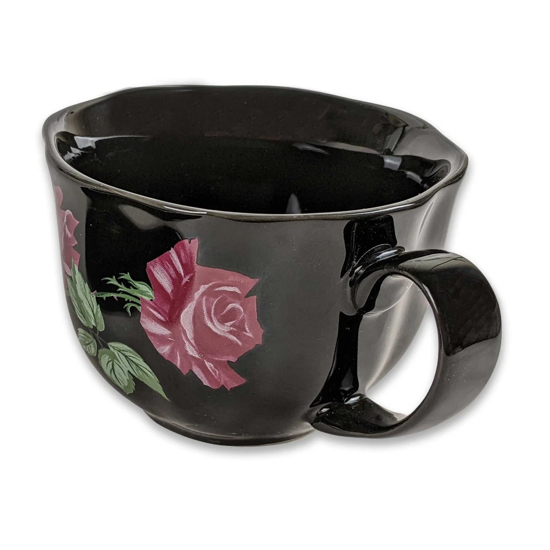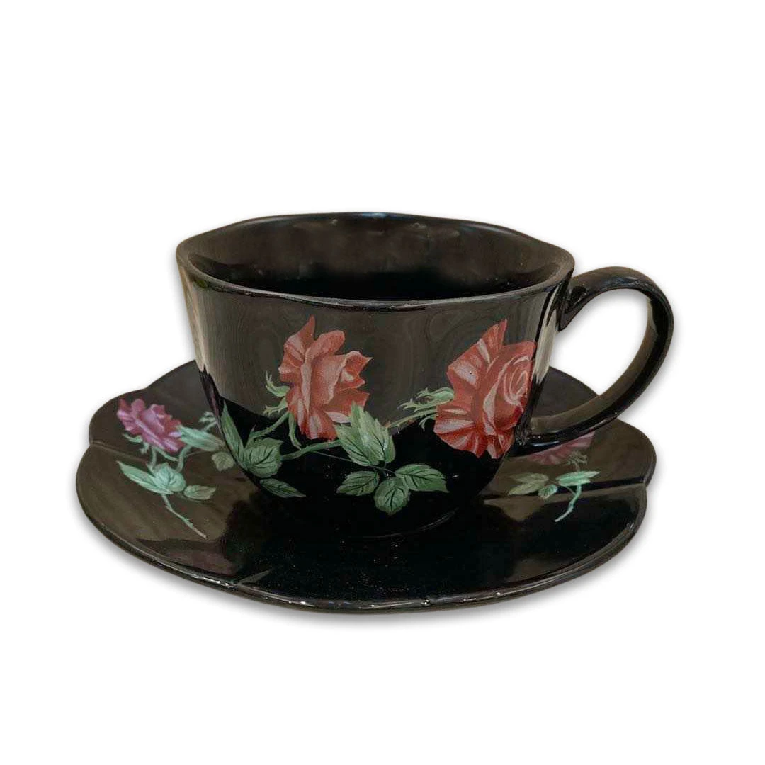 This hand-finished high-grade porcelain teacup and saucer set is perfect for those who love a good cup of tea but with a little surprise. The “Agatha” novelty teacup features my original dark red rose pattern inspired by a traditional English pattern of the 1920s updated with a striking black background.