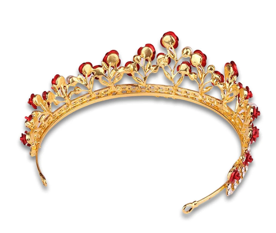 Gold-tone tiara with red roses accented with rhinestones and pearls. Attaches to head with bobby pins at the end of each loop.