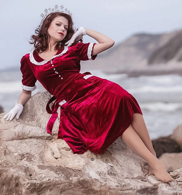 Made of rich burgundy red velvet with a hint of stretch. Inspired by dresses from the 1930s and early 1940s. Features a Peter Pan collar, puff sleeves, vintage-style metal side zipper, front pockets trimmed in vintage style lace, ornamental faux-pearl buttons, and tie-backs to cinch the waist.