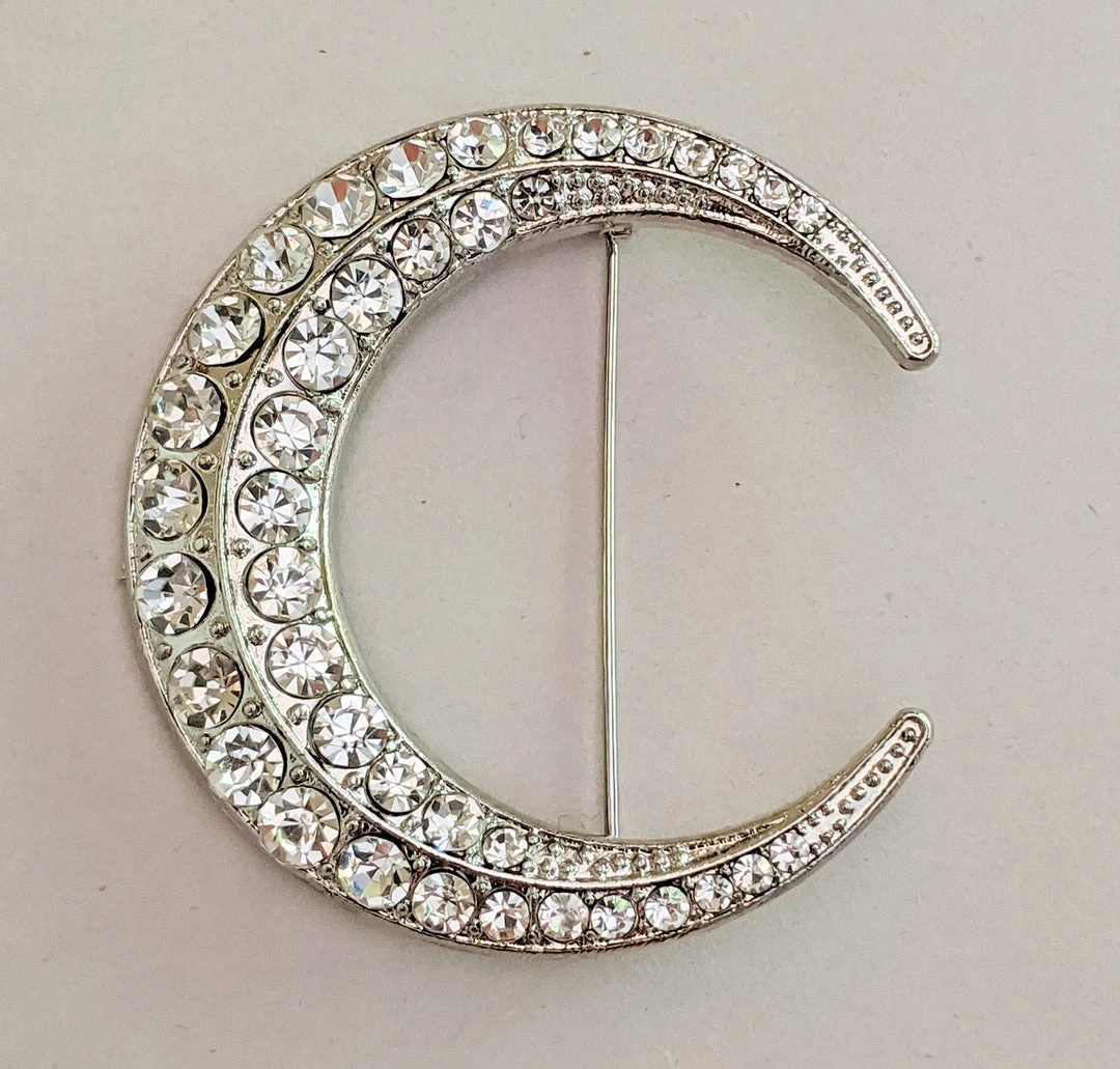 Silver-tone and rhinestone crescent moon brooch inspired by a brooch from the 19th century.