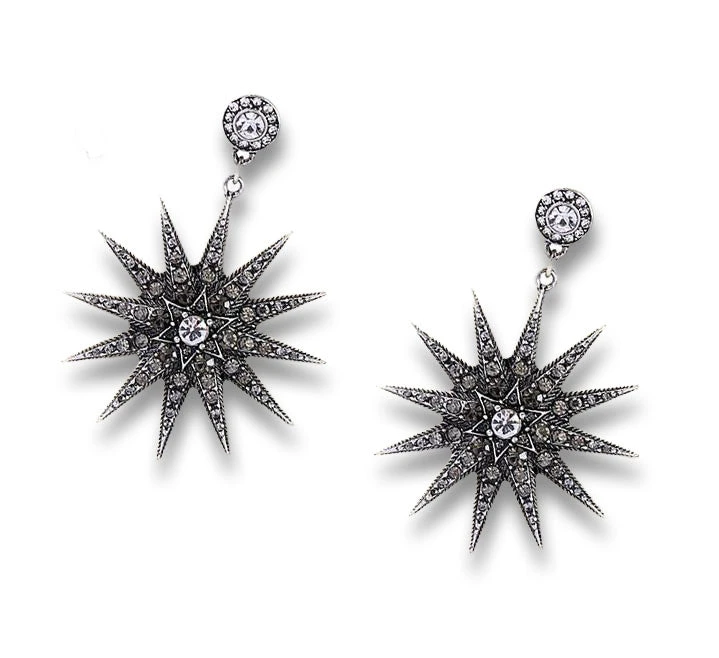 The “Quinn” earrings feature an elegant starburst with black rhinestones that surround a clear stone at the center. Height: 2 inches.