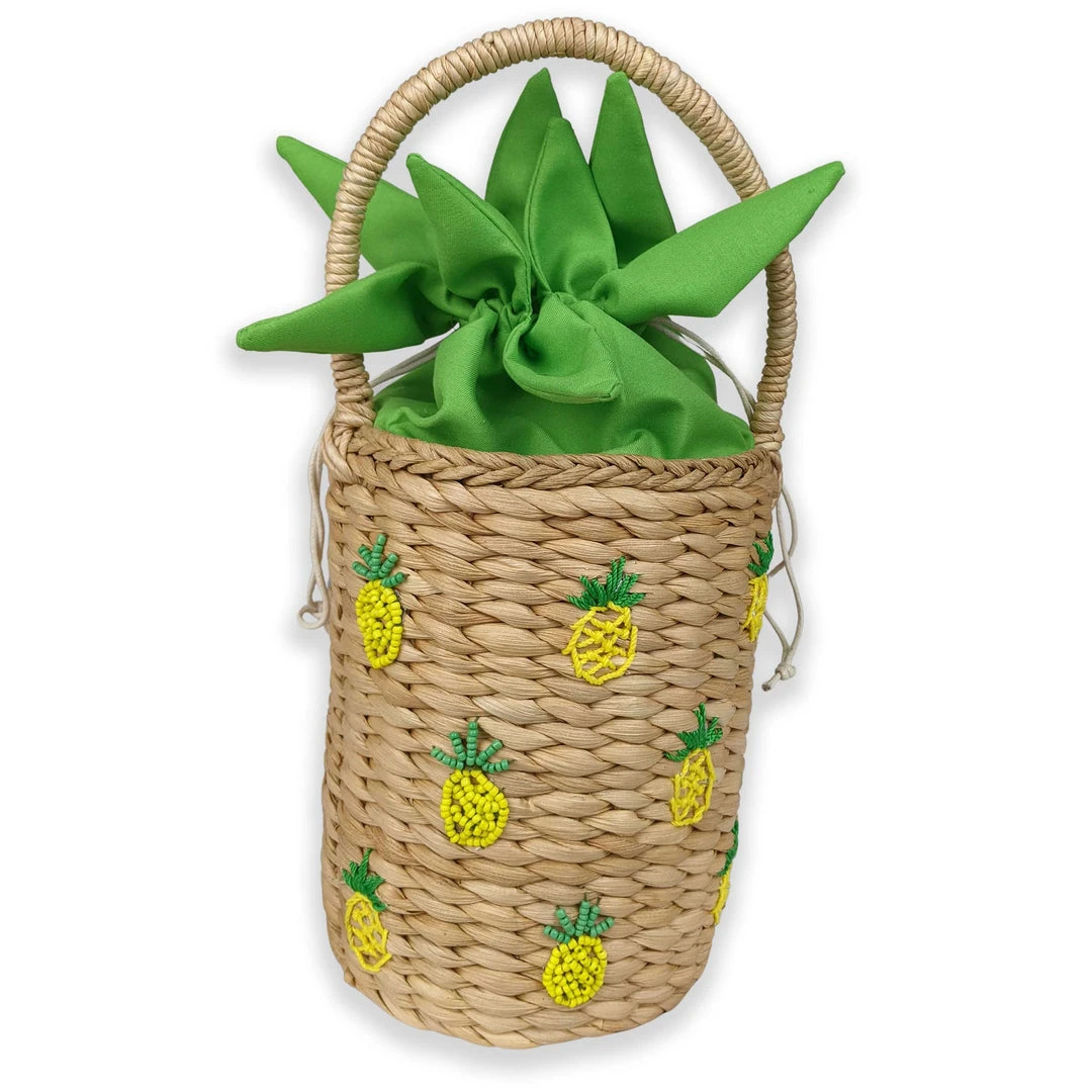 Here’s the fun, new bag you’ve been looking for! The Nia Pineapple Bag is a novelty wicker basket adorned with petite pineapples made from either wicker or beads. The green inner lining is shaped like pineapple leaves and securely stores your belongings. Closes easily with a drawstring